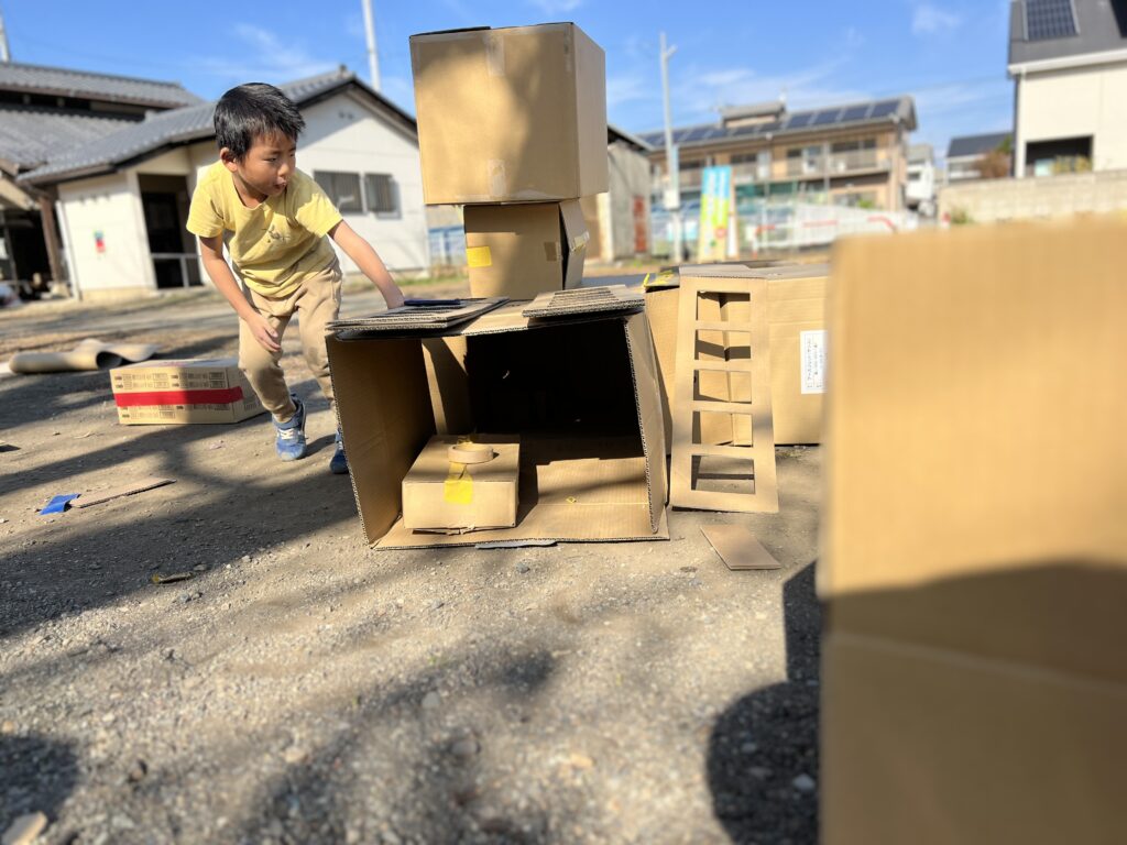ダンボールを高く積み上げるぞー!とみんなで協力をしたり、いろいろな形のダンボールを組み合わせて基地やピタゴラ装置を作ったり、