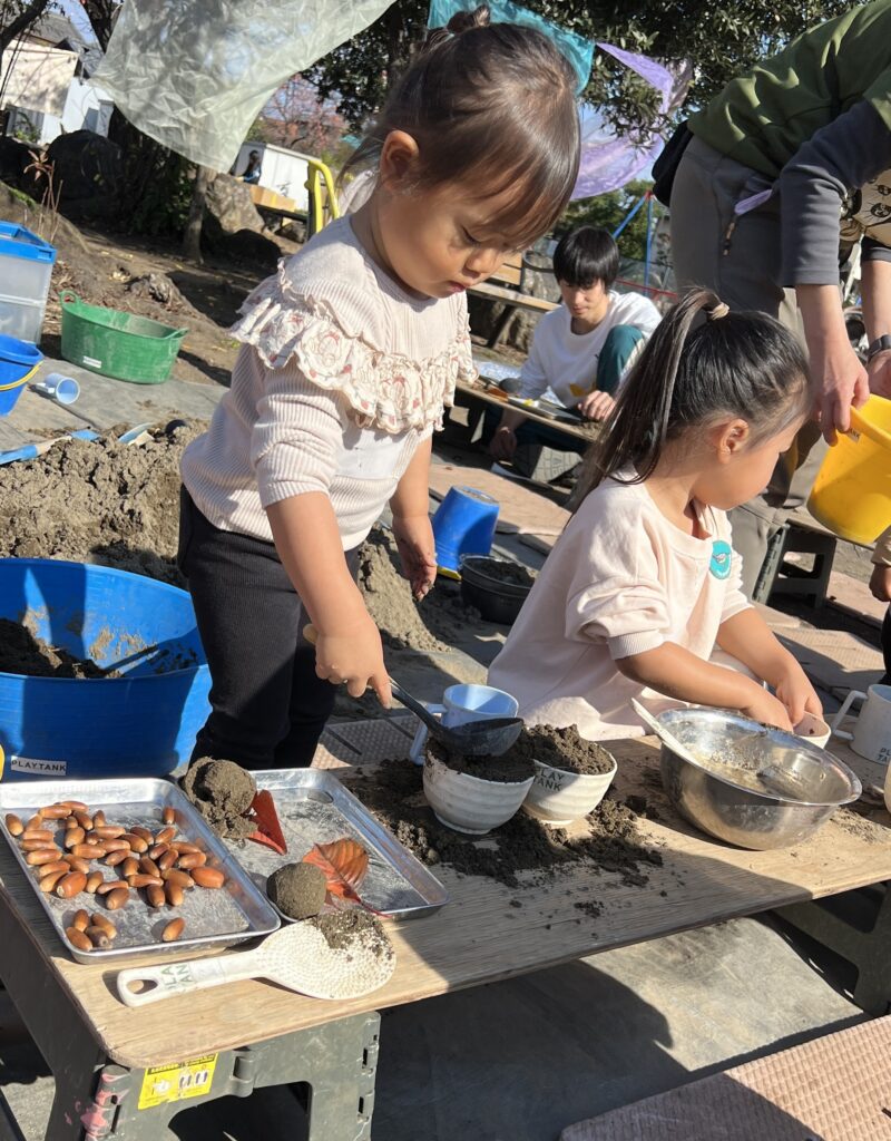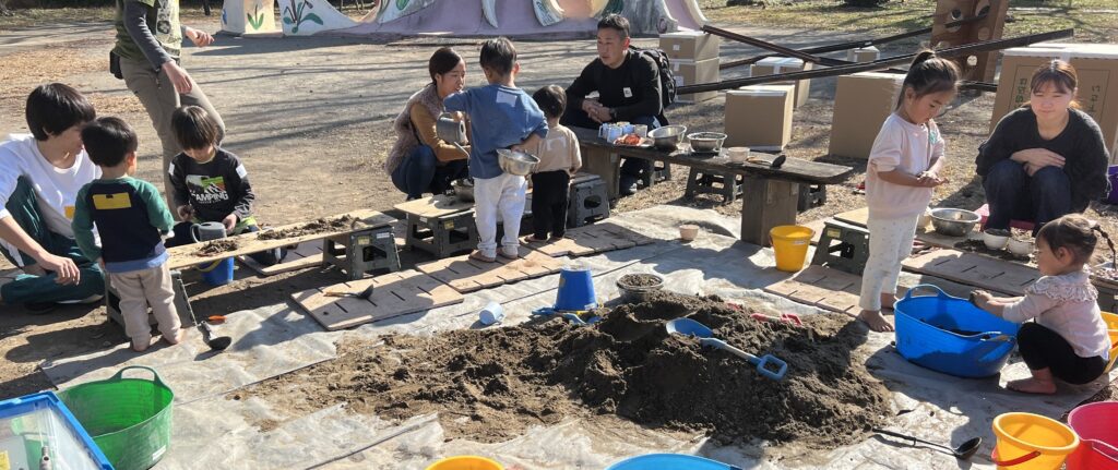 ちびっこが遊ぶエリアには、小さな土山も登場!お団子にぎにぎ、泥こねこね、感触を楽しみました。