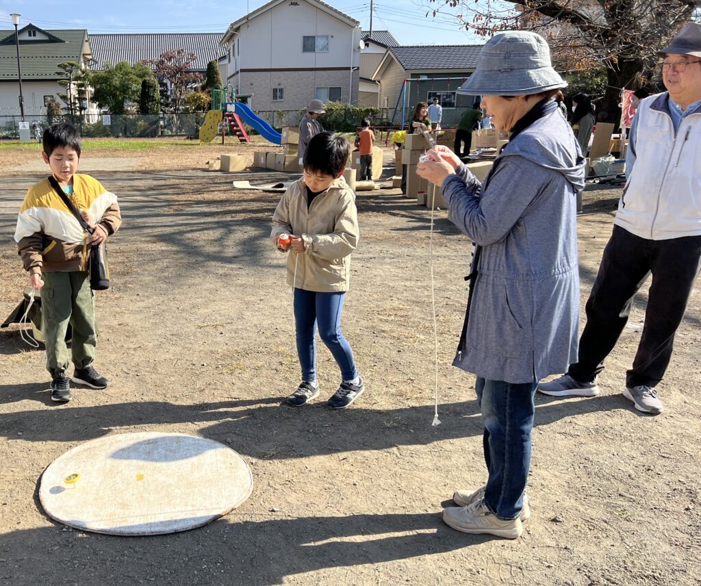 高校生が作った輪投げ?で楽しむ子も。